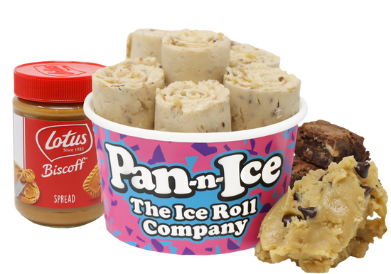 Biscoff and Cookie Dough Ice Rolls on a bed of Warm Gooey Nutella Brownie